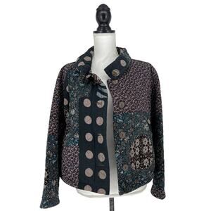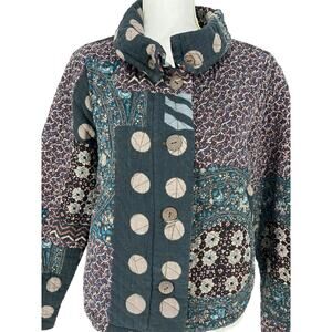A charming vintage find, this quilted cotton jacket features a whimsical floral and polka dot print with a contrast floral lining that adds unique character. Designed with a cozy silhouette, it includes a button front closure, hip pockets, long sleeves, and a buttoned collar. Crafted from 100% cotton, it’s ideal for layering in transitional weather or as a standout piece in a boho-chic wardrobe. The lightweight padding and classic quilted texture offer both comfort and nostalgic appeal for lovers of one-of-a-kind vintage outerwear.