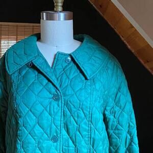 Lightweight, emerald green, swing coat shape with front pockets, oversized dagger style collar.