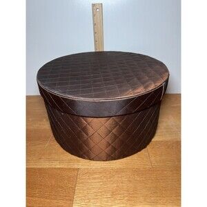This listing is for two round, quilted brown satin-covered hat boxes with matching removable lids. The larger box measures approximately 12 inches in diameter and about 6.5 inches tall. The smaller box measures approximately 9.5 inches in diameter and about 5 inches tall.