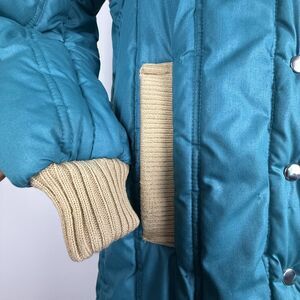 Vintage quilted longline winter coat in teal with beige ribbed knit trim. Features a snap-front closure, ribbed knit funnel collar that can be worn open or snapped up for extra warmth, and ribbed knit cuffs and pocket trim. Fully quilted interior lining provides insulation.