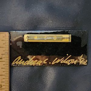 Vintage (1992) brooch. Rectangular shape. Earth tones with unusual design. Plastic. Approx. measurements: 2 3/4" x 1 1/4" Singed by artist on back with date. Initials "AW" on front. ?Andrea C. Wilson? Some wear and tear; on back of brooch coating has started to come off. Please see photos. The photos are part of the description. Smoke free home. Unable to bundle.