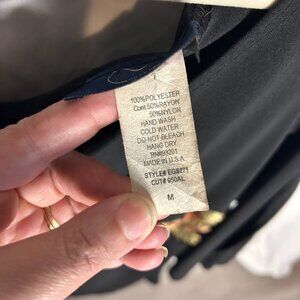 Turn heads in this striking vintage black dress by RAG, made in the USA. This medium-size dress features elegant long sleeves with dramatic cold shoulder cutouts and a flattering V-neckline on both the front and back. The highlight is the intricate brocade detail across the bust, showcasing metallic gold, red, and taupe floral patterns on a black velvet-like background.