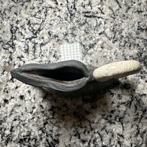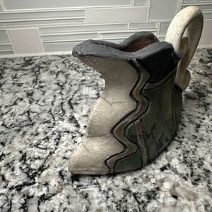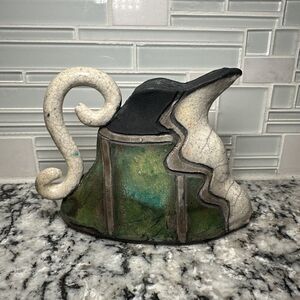 This vintage RAKU pottery vessel is a unique addition to any collection. The artist signed pitcher jug is made of clay and features an abstract pattern in multicolor. The vase has a contemporary style and is 6 inches in length, 4.5 inches in height, and 1.5 inches in width.