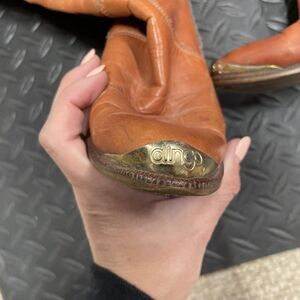 These are great boots. Very unique and in pretty good shape, considering the age. There are metal tips at the toes that say dingo. Stacked leather heel and a Phoenix embroidered at the front with Gold embellishments. These are labeled size 38 or 6 1/2 medium. There are a few issues and I have tried to photograph them. There is creasing in the leather where the toes bend. This is natural, but I did make a note of it. There is some scraping at the heel of the right boot in the back. The uppers are in good shape with embroidery and embellishments still looking nice. The boots themselves are a lovely Cordovan or orangey brown color. Please see pictures for details. These are nice boots that have a lot of life left. They may need a little bit of work or TLC from someone who knows how but they can be worn today if you like!