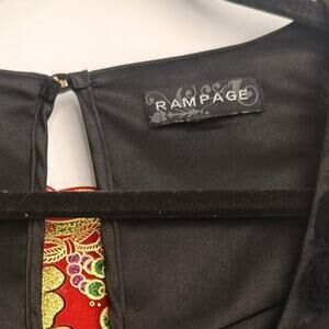 This Rampage dress feels like a total early 2000s throwback. It’s got that shiny satin look and a big enamel piece right around the collar that really stands out — kind of bold but in a cool way. The babydoll shape makes it feel playful and easy to wear, but the embellishment adds some serious personality.