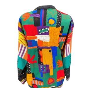 vintage hand-knit sweater, Alfonso Pozo Globetrotter, artistic knit cardigan, embroidered cotton sweater, wearable art knitwear, 90s statement sweater, bold color block knit, rare designer sweater, unique artistic fashion, abstract embroidered sweater, oversized colorful cardigan, art-inspired knit, boho eclectic sweater