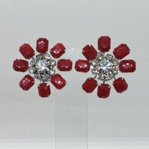 Vintage RARE Weiss Red cabochon and clear Rhinestone Flower Clip On Earrings Crystal Silver Tone Jewelry. very large size.