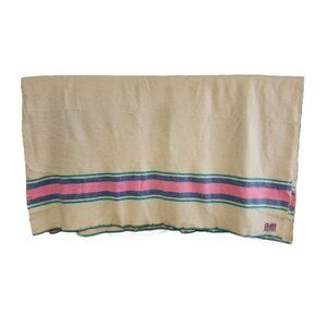 Vintage RARE Condon's 100% Pure Wool Blankets, Prince Edward Island to Newfoundland is 100% Pure Wool Blanket made by William Condon & Sons Charlottetown, Prince Edward Island, Canada, circa 1950s. WIlliam Condon & Sons blankets are highly sought by collectors. This blanket is of thick and heavy soft wool, natural cream in colour with horizontal aqua, blue & pink colored stripes at both top and bottom as well as edge stitching in aqua in colour. Canadians in Atlantic Canada would buy local sheep's wool when they were shorn in the spring, wash it, pick it and mail via Canada Post to Wm. Condon and Sons, PEI, to have blankets made. Prince Edward Island has a rich and renown heritage in textile manufacturing, particularly wool blankets. This blanket is very soft in beautiful overall condition. Approx: 63" x 76"