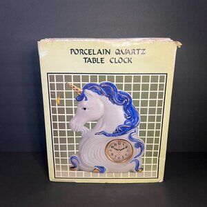 Selling a Vintage RARE Hand-Painted Porcelain Unicorn Quartz Table Clock. It measures 11" (h) x 9" (l) x 4" (w), the clock itself measures 3 1/8" (w), it's battery operated (takes 1 AA battery, which will be included), both sides can be utilized (one side has the unicorn with blue and gold hair, and the other side is all white), and it comes with it's original box. There are some paint imperfections (shown in the pictures), mainly along the base and an area on it's cheek. There's also a light rattle inside (likely a small piece that broke off inside). The box also has some wear (shown in the pictures). Has been tested, and works great!