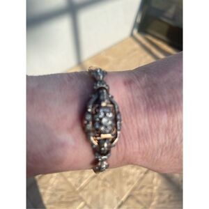 Vintage Rare Delux Swiss Made 1940’s Art Deco Rose gold over 925 Sterling Rhinestone Crystal Flip Watch. Wind up manual operation. It works fine. Most watches you will find from this era don’t work and you won’t find another one on the internet!! The price on this is firm. I’m not open to offers. This is a great price for a gorgeous watch in this condition. Fits up to a 6” wrist for a smaller person.