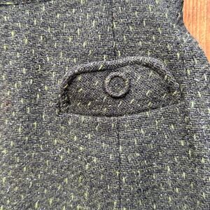 Dark green/black base color with light green flecks, and touches of light/silver throughout. Side zip and button closure. Unlined No size listed, guessing a small.