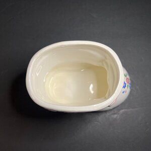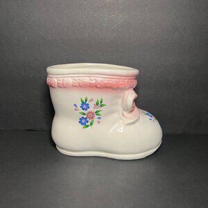 Selling a Vintage R.B.C. Ceramic Floral Boot Flowerpot Planter. It measures 4.25" (h) x 5.75" (l) x 3.5" (w), and features floral designs and a pink bow. There is a very tiny chip on the ribbon side, and paint scuff on the bow (both shown in the pictures). It's in otherwise very good condition!