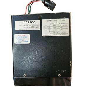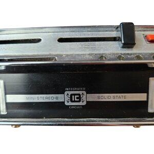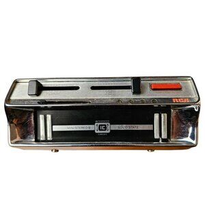 RCA 12R500, retro audio player, solid state player, integrated circuit, tone control device, volume slider, retro electronics, 12V DC player, compact music device, RCA electronics, vintage 8-track player, portable music player, collectible audio gear, black and silver player