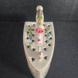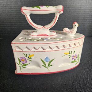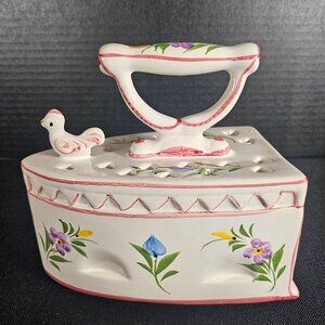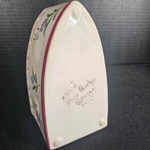 Vintage R.C.&CAL Juncal Porto de Mos, Portugal Iron Potpourri Sachet Holder #836 Is a charming decorative piece from the 1980s. Made of ceramic and hand painted in white and green, this original potpourri sachet holder exudes a unique style and craftsmanship from Portugal. This collectible item is a beautiful addition to any home decor, showcasing the artistry and traditional hand painted ceramics from the era. The marking RC and CAL da Juncal Porto de Mes appears on mid late 20th century pieces. These are locally produced hand painted Majolica style pottery. Juncal refers to a parish In Porto de Mos, Portugal. It's known for a long standing tradition of ceramics dating back to the 18th century. Measurements. Approximate. 6.5 inches high, 6.75 inches long, 3.75 inches wide. Non-smoking pet free home.