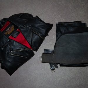 Vintage Harley-Davidson REAL leather motorcycle jacket and chaps. This was a custom made outfit that no longer fits, gently used. Size is around a Women's XS, it fit when I was around 5 ft - 5 ft 2 inches tall, 100 lbs. This is not only edgy, but well-made and heavy, perfect for a cute motorcycle chick! $500 or best offer.