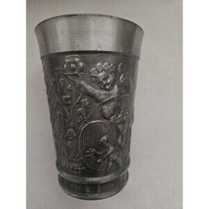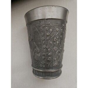 Vintage German pewter cup with folk country scenes - people drinking and eating at an inn, grape vines on a trellis, and cherubs eating grapes; marked "Rein Zinn" on bottom meaning pure tin in German. Cup has a slight oval shape. Excellent Antique condition - no damage, light overall antique patina Please photos for full description and measurements.