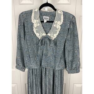 Vintage REO Original Blue White Paisley Lace Collar Secretary Dress 80s Size 14