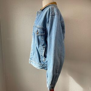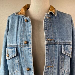 Unique vintage denim jacket measuring 21 inches armpit to armpit laying flat and 23 inches in length from shoulder to hem.
