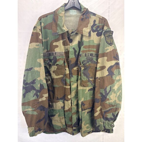 Vintage R.I. Militia 17th Artillery Camo Jacket XL HEOLY Patch Military Uniform