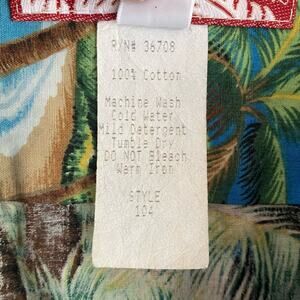 Spread collar; short sleeves; left chest pocket; colorful island scene with mountains, palm trees, boats, tropical fish, turtles, and dolphins; coconut buttons, seamed back, rear side pleats