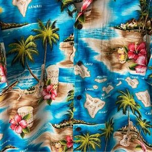 Colorful, vibrant print of Hawaiian islands, Palm trees and hibiscus plant