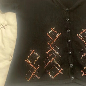 Vintage R&K brand size 8 cotton blend sweater. Short sleeve, vneck, button up with bronze sequin accents. Very nice preowned condition.
