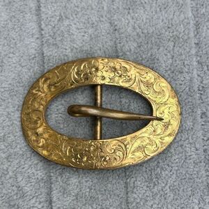 Intricate paisley floral engravings that echo ancient motifs. Crafted in an oval shape measuring 2 3/8” by 1 5/8”, the buckle features a warm, aged brass finish that enhances its vintage appeal. The piece is signed on the back.
