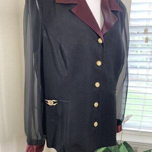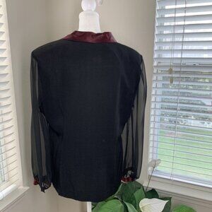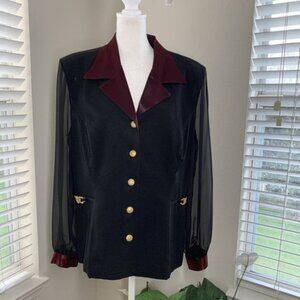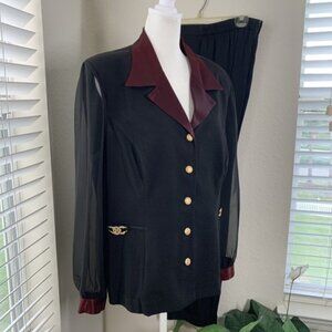 Vintage R&M Richards By Karen Kwong Pant Suit Size 16 Black w\ Maroon Satin Trim