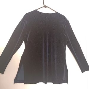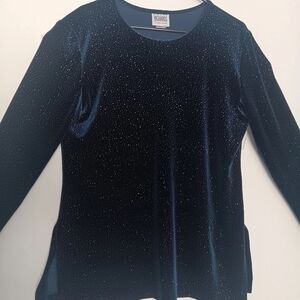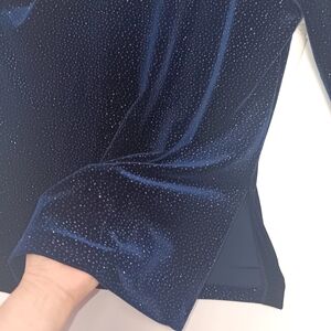 Velvet set, R&M Richards, glitter top, long sleeves, high waisted pants, straight leg, elastic waist, size 10, full stretch, 90% polyester, 10% spandex, navy blue, 30 inch inseam, crew neck top, slit detail on sides of top, clean garments, lightly used, good condition.