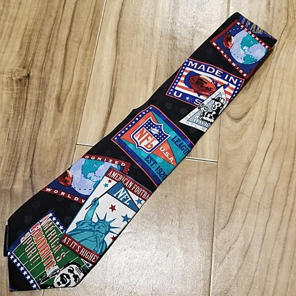 Men's 1990s Vintage Ralph Marlin RM Style Nfl Football Themed Black Necktie