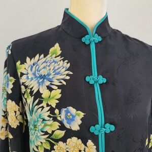 Asian-inspired 100% silk mandarin collar blouse with frog closures and sequined floral details. Black silk pants with satin lining and elastic across back of waist. Side zipper with button closure.