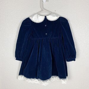 Vintage ROSE COTTAGE GIRLS SIZE 6 Navy Blue VELVET BIB DRESS LACE