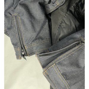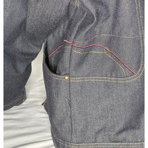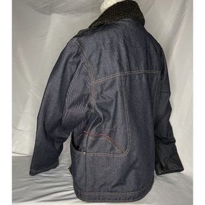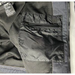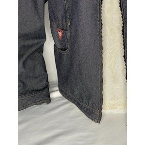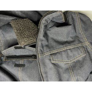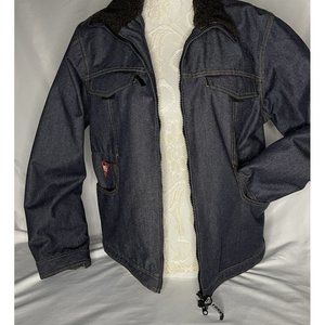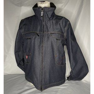 Great looking X Series Roxy jacket with a denim look. ZIP front, zip sleep ends, zip closure slash and chest pockets, black Sherpa collar. In my opinion runs a bit small. Note not marked as to water but assume based on fabric it is water resistant. Multiple pockets - two open look front with zip, one side has small "jean/change" pocket. Inside has zip pocket. Adjustable waist with elasticized cord.