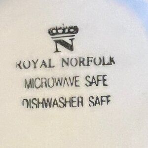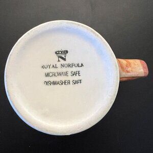 Royal Norfolk vintage, off-white stoneware mug features a wraparound hand painted flower and fresh fruit pattern in golden yellow, rose green, and earthy brown. A decorative peach and rose colored handle and bands of color below the rim completes the design. Dishwasher and microwave safe. Measures 4” tall with a 3.25” diameter. Holds 12 fluid oz.
