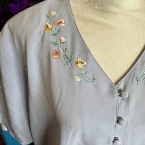 Lovely vintage RR Russ light blue button-up blouse in size 18! The delicate embroidery adds a touch of elegance. Perfect for a relaxed yet stylish look. Get ready to turn heads!