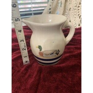 This vintage R.R.P CO. pottery pitcher from Roseville, Ohio is a unique addition to any collection. The pitcher features a colorful painted duck sitting on a nest, and has a production style of art pottery. It was manufactured in 1983 using the pottery production technique, and has a backstamp of painted. The pitcher is made of pottery material and has a primitive style, with a brand of Roseville and a type of pitcher. It is an original vintage item, perfect for collectors of decorative cookware, dinnerware, and serveware.