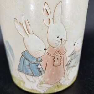 Creamy beige glazed stoneware with whimsical hand-painted bunny rabbit family scene in pastel blue and pink tones