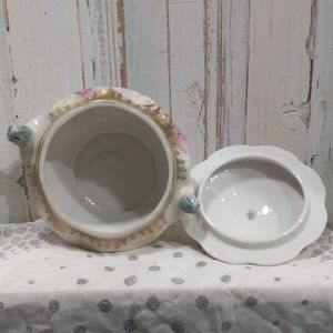 This is a vintage sugar bowl with matching lid. It measures 4 3/4" tall by 5 1/2" across and has a beautiful pink floral and gold design. It is in wonderful condition and stamped RS Prusia on the bottom.