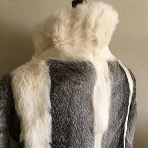 Gorgeous 1960s color block rabbit coat. So soft and super warm. Has two deep front pockets. Fastened with buttons and elastic loops. No fur damage what so ever. Very minimal shedding, but most furs she’d little bit. Will fit small and smaller medium sizes. I am size 8 and it fits me just right. However it doesn’t have long sleeves.