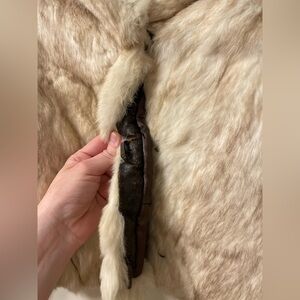 Cream, rabbit fur cropped jacket with a plush shawl collar. Soft, warm texture ideal for layering over dresses or evening looks. Feminine silhouette and neutral cream tone for versatile styling. It is a size L, but runs smaller and more fitted. There is wear on the leather near the fasteners in front, but the fur covers the distress. Pockets on the front