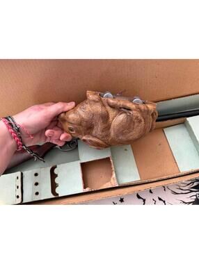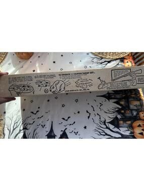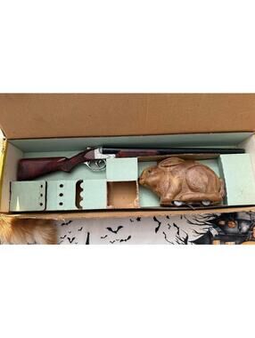 This is a 1960's Play Set From Marx Toys. There is a plastic shotgun that shoots darts, and a mechanical rabbit that you wind up and it runs around. The gun is approx. 23 5/8" long, and the rabbit is approx. 8 1/4" long. The rabbit works fine. I don't know if the gun works because it shoots rubber tipped darts, and there are none with the set. I pushed a thin dowl into the barrels, and there is spring action - the triggers seem to work ok. The box is in fairly good condition, but the cover comes off. See the pictures for more. This item is a plastic toy.