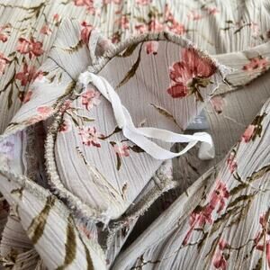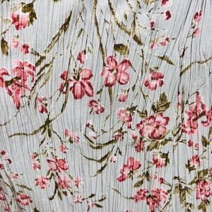 Vintage 80s/90s Rabbit Rabbit Rabbit Designs floral maxi dress, made in the USA. Crafted from lightweight stretch crinkle rayon with an allover textured finish. Features a surplice V-neckline, short sleeves with sewn-in shoulder pads, straight column silhouette, and attached tie sash for optional shaping. Pull-on style with a flexible, comfortable fit.