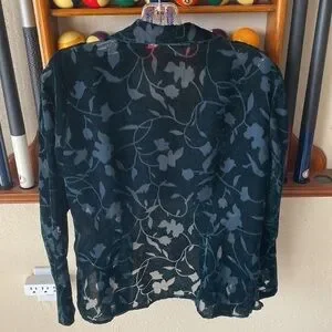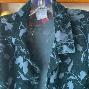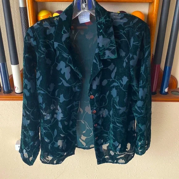 Vintage Rabbit Rabbit Rabbit Designs button down blouse velour. Color green. Beautiful velour mix with leaves that are see through fabric. Button down collared. Can be used as blouse or very light jacket. No size but I would say medium. Please refer to pictures. As is. Ask if any questions. Reasonable offers please