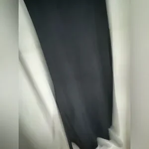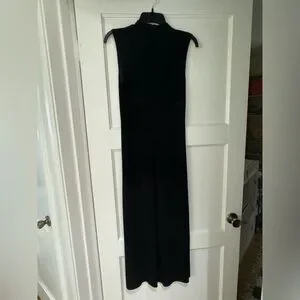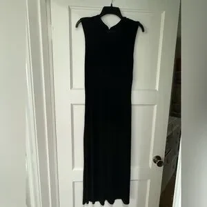 Super slinky black dress with mock neck. Fabric is very stretchy and comfortable. Slits on side of skirt both sides. Size 10. Acetate / Spandex Blend