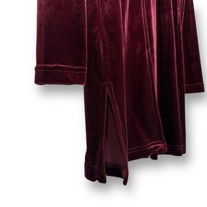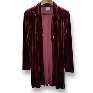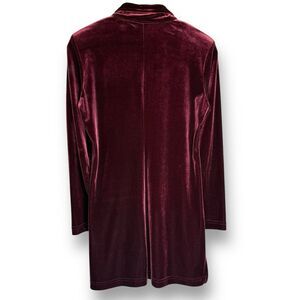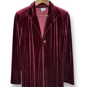 Rich velvet unlined 3/4 length duster in perfect condition. Single button with self loop closure, extra button on the inside, side vents. So elegant and luxurious, will make you feel like a million bucks! Size 4P, see measurements in photo for best fit.