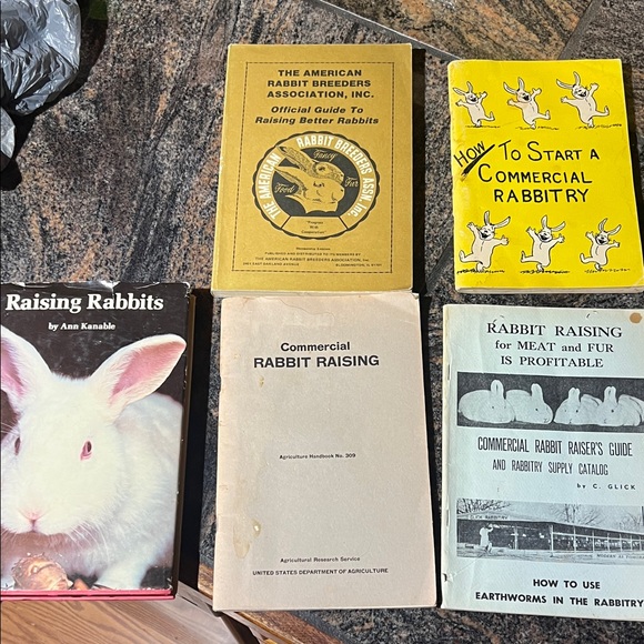 Set of books on rabbit raising and commercial rabbitry. Includes guides and manuals.