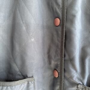 Elegant and lightweight vintage Italian quilted jacket by Racal by Caldarelli. Crafted in Italy from a soft, satiny nylon-blend fabric (with PU and PVC for structure and sheen), this piece has a minimalist silhouette and refined details — rounded Peter Pan-style collar, fabric-covered buttons, and large front patch pockets. The cut is slightly boxy with shorter sleeves and a delicate feel overall, typical of refined Italian outerwear from the late 20th century.
