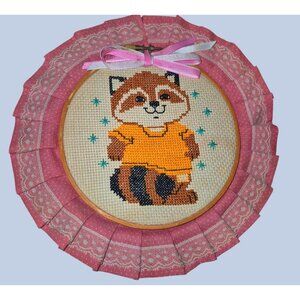 This handmade cross-stitch features a charming raccoon in an orange shirt, framed in a 9.5" hoop with pink lace ruffle trim. A delightful decorative piece for adding character to any space.