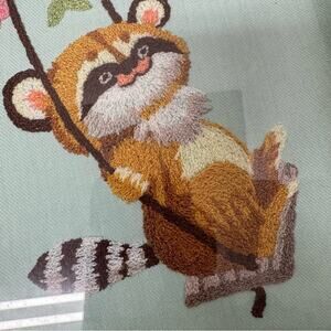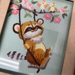 Vintage Raccoon Tree Swing Bird Folk Art Hand Embroidered Wood Framed 10 X 15