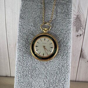 Vintage, Almost New, Perfect, 1.25 inch in diameter Racine 1940's-50's Swiss 17 Jewel Pendant Watch, Necklace Watch, with enameled and hand painted Blue flowers on the reverse and Green leaves on both sides of the case. Has a Coin Edge on both sides. 10 Micron Gold Plated Case and Raised Hour Markers works great, in almost new condition, 925 Italian 2MM Rope Chain 22K Gold plated Vermeil measures 30 inches long, and watch pendant is approx. 1.75 inches with stem can also be used as a purse or pocket watch